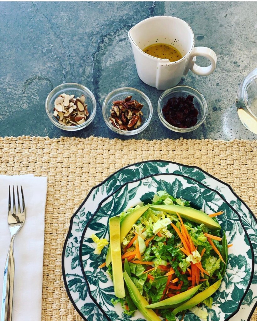 Our lunch inspo today is Khloe Kardashian’s avocado salad with lettuce and grated carrots topped with sliced almonds and pecans, cranberries and drizzled with vinaigrette.
